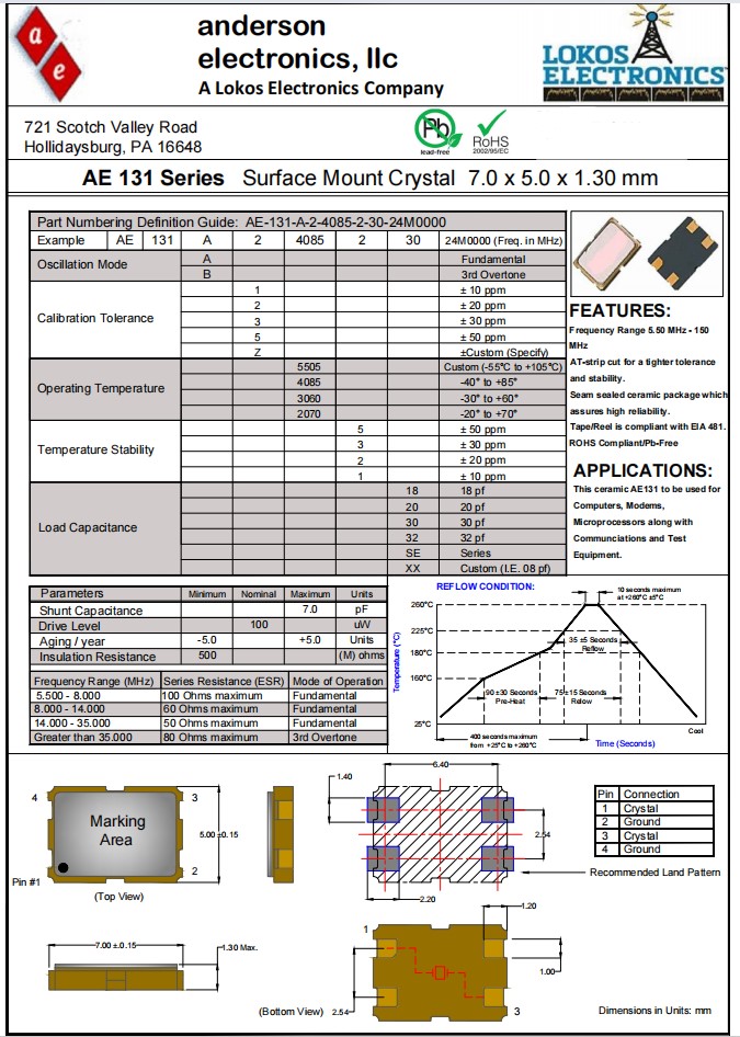AE-131-A-2-4085-2-30-28M0000,7050mm,Anderson品牌,AE131,微處理器應用晶振,參數表