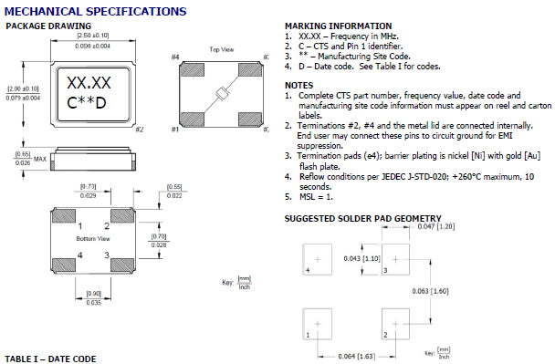 CTS晶振425,425F35B027M0000無源貼片晶振 尺寸圖