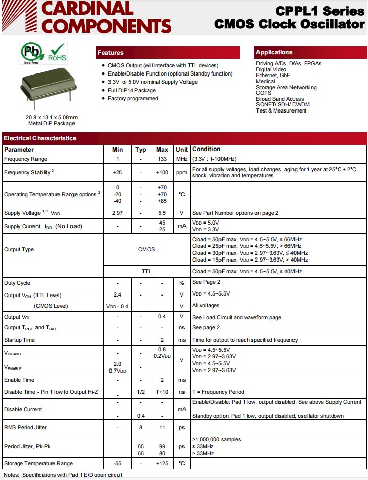 CMOS時鐘振蕩器,CPPLC1LTA7BP125.0TS,卡迪納爾石英晶振,參數(shù)表