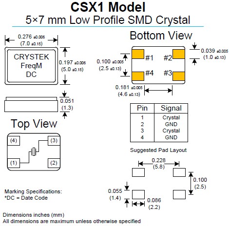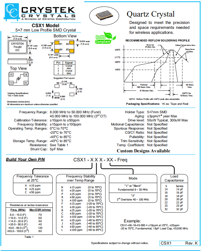 CRYSTEK晶振,CSX1晶振,無鉛環(huán)保晶振.小型表面貼片晶振型,是標準的石英晶體諧振器,適用于寬溫范圍的電子數(shù)碼產(chǎn)品,家電電器及MP3,MP4,播放器,單片機等領(lǐng)域.可對應8.000MHz以上的頻率,在電子數(shù)碼產(chǎn)品,以及家電相關(guān)電器領(lǐng)域里面發(fā)揮優(yōu)良的電氣特性,滿足無鉛焊接的回流溫度曲線要求.