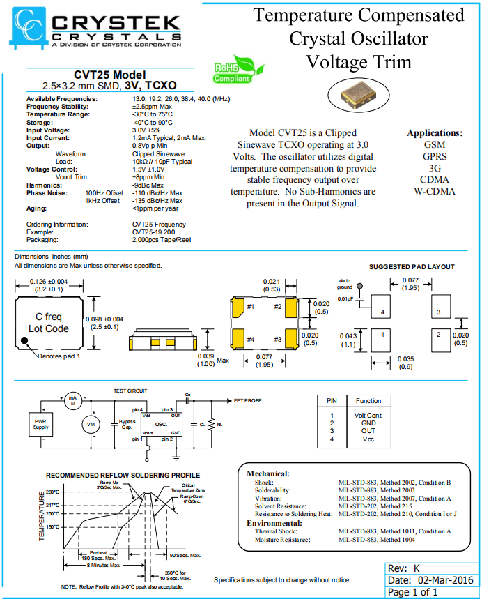 CRYSTEK晶振,CVT25晶振,溫補晶體振蕩器.小型SMD有源晶振,從最初超大體積到現(xiàn)在的7050mm,6035mm,5032mm,3225mm,2520mm體積,有著翻天覆地的改變,體積的變小也試產(chǎn)品帶來了更高的穩(wěn)定性能,接縫密封石英晶體振蕩器,精度高,覆蓋頻率范圍寬的特點,SMD高速自動安裝和高溫回流焊設(shè)計,Optionable待機輸出三態(tài)輸出功能,電源電壓范圍:1.8V?5V,高穩(wěn)定性,低抖動,低功耗,主要應(yīng)用領(lǐng)域:無線通訊,高端智能手機,平板筆記本W(wǎng)LAN,藍牙,數(shù)碼相機,DSL和其他IT產(chǎn)品的晶振應(yīng)用,三態(tài)功能,PC和LCDM等高端數(shù)碼領(lǐng)域,符合RoHS/無鉛.