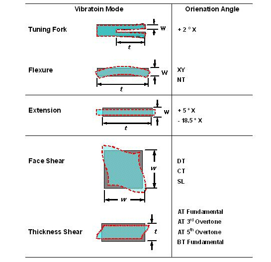 經(jīng)由不同的石英切割角度及不同電極型狀的電場(chǎng)效應(yīng), 石英芯片展現(xiàn)了各種不同的振動(dòng)模態(tài). 以經(jīng)常產(chǎn)生的振動(dòng)模態(tài)可以概分為擾曲模態(tài)(flexure mode), 伸縮模態(tài)(extension mode), 面剪切模態(tài)(face shear mode) 和 厚度剪切模態(tài)(thickness shear mode). 這幾種振動(dòng)模態(tài)以簡(jiǎn)單的方法在表一中可以看到. 在實(shí)際狀況中, 石英芯片并不是一定祇有單一種振動(dòng)模態(tài), 而可能有多種模態(tài)同時(shí)存在在一個(gè)石英芯片的振蕩中, 經(jīng)由適當(dāng)?shù)脑O(shè)計(jì), 可以壓制其它不希望產(chǎn)生的振動(dòng)模態(tài)(unwanted mode), 來達(dá)到主要振動(dòng)模態(tài)的最佳化.