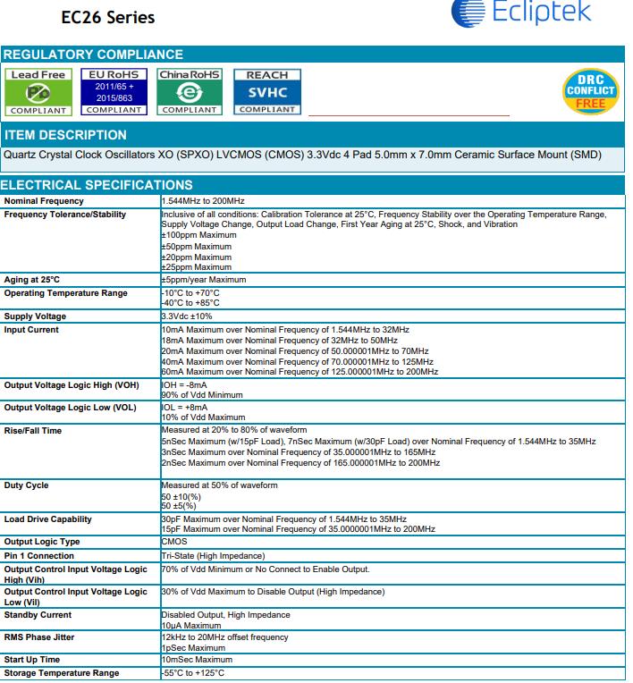 EC26石英晶體振蕩器,ECLIPTEK晶振,EC2600ETTTS-20.000M-TR晶振,小型SMD有源晶振,從最初超大體積到現(xiàn)在的7050mm,6035mm,5032mm,3225mm,2520mm體積,有著翻天覆地的改變,體積的變小也使產(chǎn)品帶來了更高的穩(wěn)定性能,接縫密封石英晶體振蕩器,精度高,覆蓋頻率范圍寬的特點(diǎn),SMD高速自動安裝和高溫回流焊設(shè)計(jì),Optionable待機(jī)輸出三態(tài)輸出功能,電源電壓范圍:1.8V~5V,高穩(wěn)定性,低抖動,低功耗,主要應(yīng)用領(lǐng)域:無線通訊,高端智能手機(jī),平板筆記本W(wǎng)LAN,藍(lán)牙,數(shù)碼相機(jī),DSL和其他IT產(chǎn)品的晶振應(yīng)用,三態(tài)功能,PC和LCDM等高端數(shù)碼領(lǐng)域,符合RoHS/無鉛.