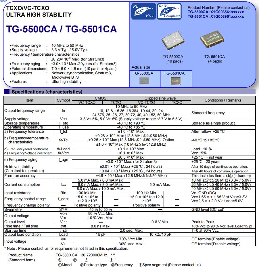 | X1G0039010102 | TG-5501CA | 12.800000 MHz | 7.00 x 5.00 x 1.50 mm | Clipped sine wave | 3.135 to 3.465 V | +/-1.0 ppm | -40 to +85 °C |