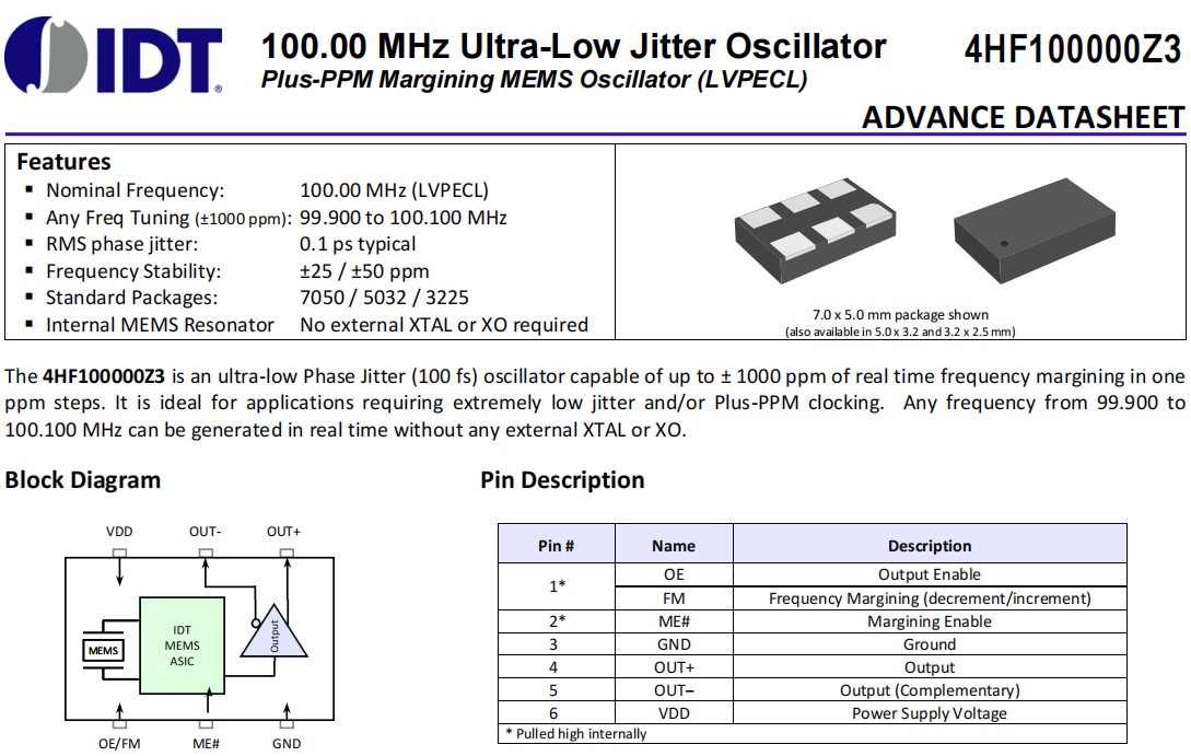 瑞薩MEMS振蕩器,4HF100000Z3BACTGI8,超低相位噪聲晶振,六腳貼片晶振,6G以太網應用晶振,參數表