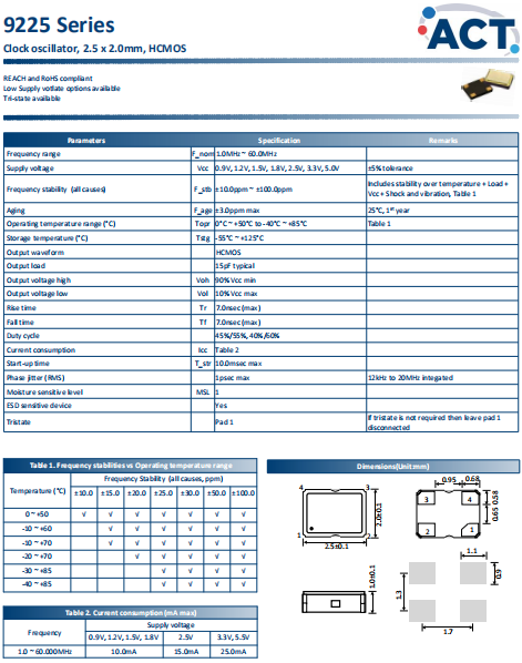 ACT晶振,9225晶振,普通有源晶振.有源晶振,是只晶體本身起振需要外部電壓供應,起振后可直接驅動CMOS 集成電路,產品本身已實現與薄型IC(TSSOP封裝,TVSOP封裝)同樣的1mm厚度,斷開時的消費電流是15 µA以下,編帶包裝方式可對應自動搭載及IR回流焊接(無鉛對應)產品有幾種電壓供選1.8V,2.5V,3V3.3V,5V,以應對不同IC產品需要.