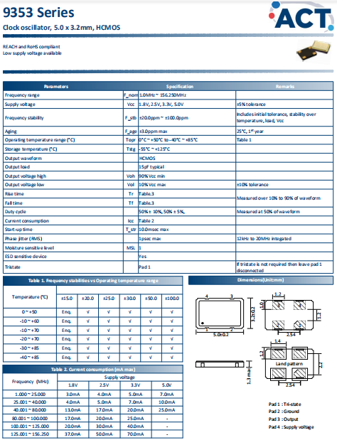 ACT晶振,9353晶振,低損耗振蕩器.智能手機晶振,產品具有高精度超小型的表面貼片型石英晶體振蕩器,最適用于移動通信終端的基準時鐘等移動通信領域.比如智能手機,無線通信,衛(wèi)星導航,平臺基站等較高端的數(shù)碼產品,晶振本身小型,薄型具備各類移動通信的基準時鐘源用頻率,貼片晶振具有優(yōu)良的電氣特性,耐環(huán)境性能適用于移動通信領域,滿足無鉛焊接的高溫回流溫度曲線要求.