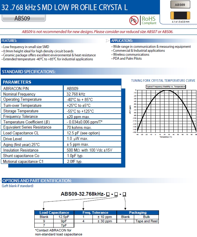 Abracon晶振, ABS09-32.768KHZ-9-T石英晶體,ABS09晶體諧振器.32.768K時(shí)鐘晶體具有小型,薄型,輕型的貼片晶振表面音叉型晶體諧振器,產(chǎn)品具有優(yōu)良的耐熱性,耐環(huán)境特性,可發(fā)揮晶振優(yōu)良的電氣特性,符合RoHS規(guī)定,滿足無鉛焊盤的高溫回流溫度曲線要求,金屬外殼的封裝使得產(chǎn)品在封裝時(shí)能發(fā)揮比陶瓷諧振器外殼更好的耐沖擊性.