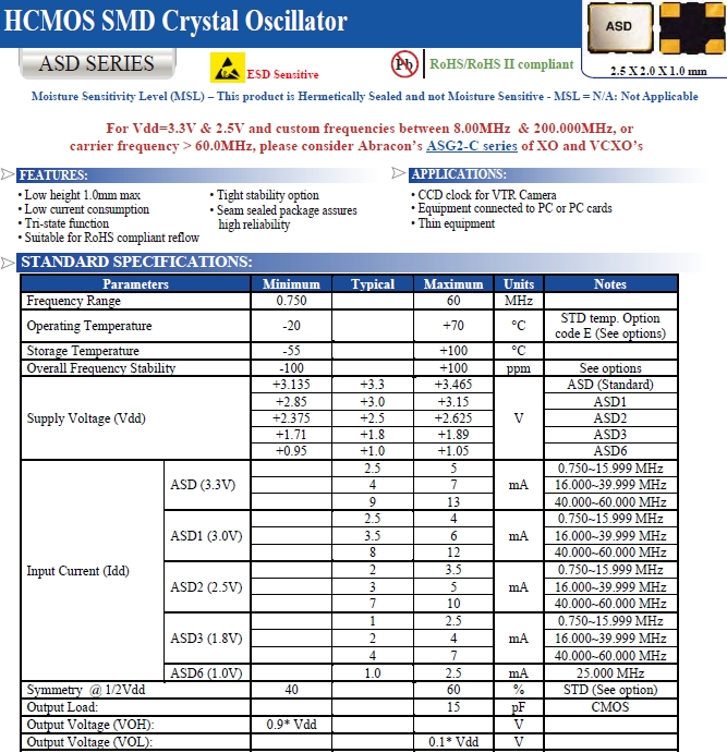 Abracon晶振,ASD3-25.000MHZ-EC-T有源晶體,ASD晶體振蕩器.小體積貼片2520mm晶振,外觀小型,表面貼片型晶體諧振器,因本身體積小等優(yōu)勢,適用于移動通信終端的基準(zhǔn)時鐘等移動通信領(lǐng)域.小型,薄型,輕型具備優(yōu)良的耐環(huán)境特性及高耐熱性強(qiáng).滿足無鉛焊接的回流溫度曲線要求.