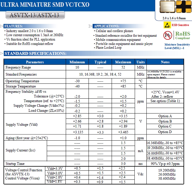 Abracon晶振,有源晶振,ASTX-13貼片晶振.貼片石英晶體,體積小,焊接可采用自動貼片系統,產品本身小型,表面貼片晶振,特別適用于有小型化要求的電子數碼產品市場領域,因產品小型,薄型優勢,耐環境特性,包括耐高溫,耐沖擊性等,在移動通信領域得到了廣泛的應用,晶振產品本身可發揮優良的電氣特性,滿足無鉛焊接的高溫回流溫度曲線要求.