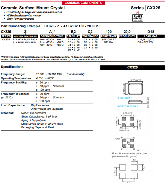 Cardinal晶振,CX325晶振,壓電石英晶體.小型貼片石英晶振,外觀尺寸具有薄型表面貼片型石英晶體諧振器,特別適用于有小型化要求的市場領(lǐng)域,比如智能手機(jī),無線藍(lán)牙,平板電腦等電子數(shù)碼產(chǎn)品.晶振本身超小型,薄型,重量輕,晶體具有優(yōu)良的耐環(huán)境特性,如耐熱性,耐沖擊性,在辦公自動化,家電相關(guān)電器領(lǐng)域及Bluetooth,Wireless LAN等短距離無線通信領(lǐng)域可發(fā)揮優(yōu)良的電氣特性,滿足無鉛焊接的回流溫度曲線要求.