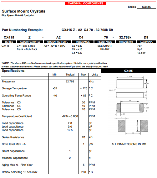 Cardinal晶振,CX415晶振,二腳貼片晶振.貼片表晶32.768K系列具有超小型,薄型,質(zhì)地輕的表面貼片音叉型石英晶體諧振器,晶振產(chǎn)品本身具備優(yōu)良的耐熱性,耐環(huán)境特性,在辦公自動化,家電領域,移動通信領域可發(fā)揮優(yōu)良的電氣特性,符合無鉛標準,滿足無鉛焊接的回流溫度曲線要求,金屬外殼的石英晶振使得產(chǎn)品在封裝時能發(fā)揮比陶瓷晶振外殼更好的耐沖擊性能.