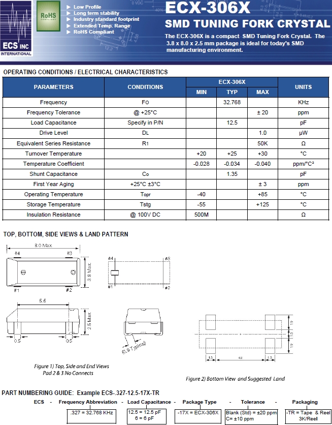 ECS晶振,ECS晶振,ECS-.327-6-17X-TR表晶,ECX-306X千赫晶振.32.768K時鐘晶體是表面音叉型晶體諧振器,產品具有優良的耐熱性,耐環境特性,可發揮晶振優良的電氣特性,符合RoHS規定,滿足無鉛焊盤的高溫回流溫度曲線要求,金屬外殼的封裝使得產品在封裝時能發揮比陶瓷諧振器外殼更好的耐沖擊性.