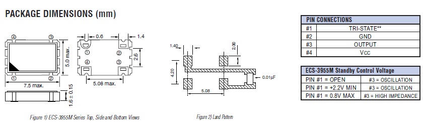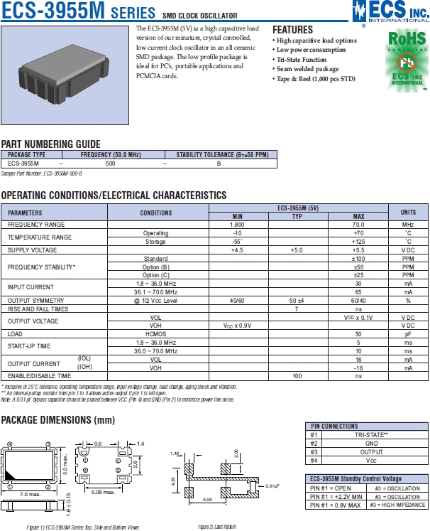 ECS晶體,伊西斯晶振,ECS-3955M石英晶振.有源晶振,是只晶體本身起振需要外部電壓供應,起振后可直接驅動CMOS集成電路,產品本身已實現與薄型IC(TSSOP封裝,TVSOP封裝)同樣的1mm厚度,斷開時的消費電流是15µA以下,編帶包裝方式可對應自動搭載及IR回流焊盤(無鉛對應)產品有幾種電壓供選1.8V,2.5V,3V3.3V,5V,以應對不同IC產品需要.