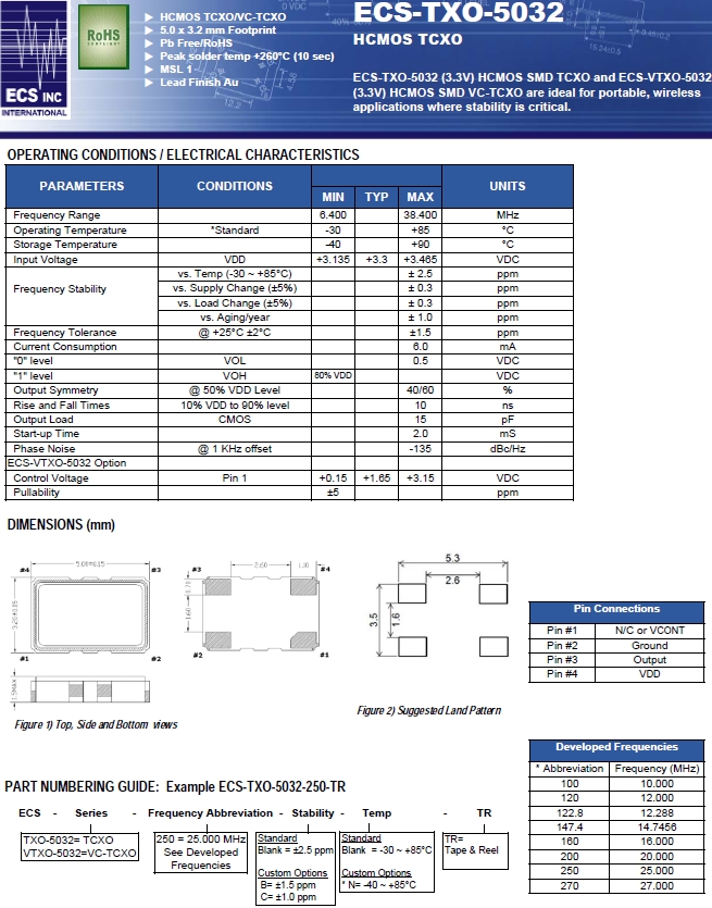ECS晶振,ECS-TXO-5032-270-TR石英振蕩器,ECS-TXO-5032有源晶體.溫補(bǔ)晶振(TCXO)產(chǎn)品本身具有溫度補(bǔ)償作用,高低溫度穩(wěn)定性:頻率精度高0.5 PPM-2.0 PPM,工作溫度范圍:-30度至85度,電源電壓:1.8V-3.3V之間可供選擇,產(chǎn)品本身具有溫度電壓控制功能,世界上較薄的晶振封裝,頻率:26兆赫,33.6兆赫,38.4兆赫,40兆赫,因產(chǎn)品性能穩(wěn)定,精度高等優(yōu)勢,被廣泛應(yīng)用到一些比較有品質(zhì)的數(shù)碼通訊產(chǎn)品領(lǐng)域,導(dǎo)航定位系統(tǒng),智能手機(jī),WiMAX和蜂窩和無線通信等產(chǎn)品,符合RoHS/無鉛.