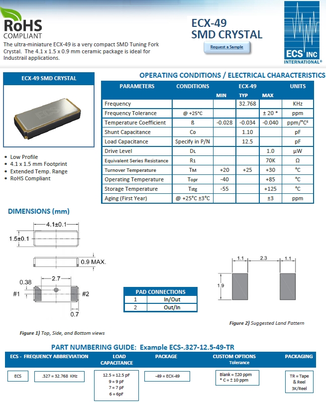 ECS晶體,伊西斯晶振,ECX-49時鐘晶振.小型,薄型,質地輕的表面貼片音叉型晶體諧振器,手機晶體,產品體積小,特別適用于各種小巧的便攜式消費電子數碼產品,在移動通信領域廣泛的應用,晶振產品本身可發揮優良的電氣特性,滿足無鉛焊盤的高溫回流溫度曲線要求.
