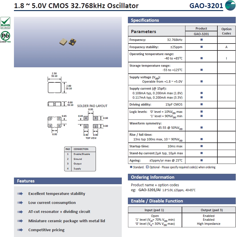 Golledge晶振,石英晶振,GAO-3201表晶.小型,薄型,質(zhì)地輕的表面貼片音叉型晶體振蕩器,手機晶體,產(chǎn)品體積小,特別適用于各種小巧的便攜式消費電子數(shù)碼產(chǎn)品,在移動通信領域廣泛的應用,晶振產(chǎn)品本身可發(fā)揮優(yōu)良的電氣特性,滿足無鉛焊盤的高溫回流溫度曲線要求.