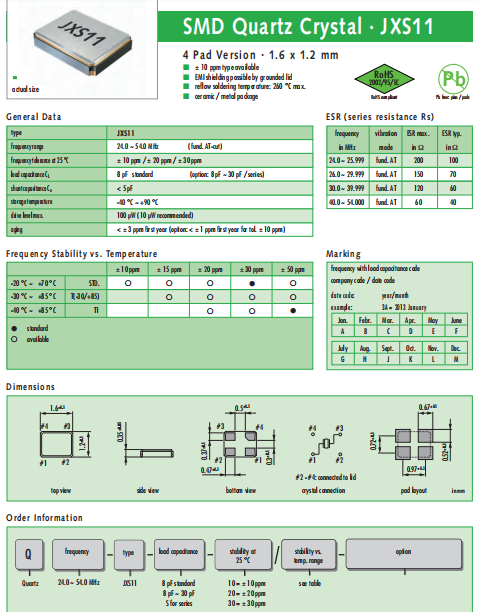 JAUCH晶振,JXS11晶振,高品質諧振器.貼片石英晶體,體積小,焊接可采用自動貼片系統,產品本身小型,表面貼片晶振,特別適用于有小型化要求的電子數碼產品市場領域,因產品小型,薄型優勢,耐環境特性,包括耐高溫,耐沖擊性等,在移動通信領域得到了廣泛的應用,晶振產品本身可發揮優良的電氣特性,達到了無鉛焊接的高溫回流溫度曲線的標準.