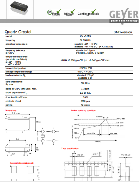 Geyer晶振,KX-327S晶振,無鉛晶振.超小型,薄型,質地輕的表面貼片音叉型石英晶體諧振器,手機晶體,產品體積小,特別適用于各種小巧的便攜式消費電子數碼產品,在移動通信領域得到了廣泛的應用,晶振產品本身可發揮優良的電氣特性,滿足無鉛焊接的高溫回流溫度曲線要求.