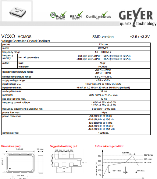 Geyer晶振,KXO-72晶振,環保振蕩器.具有最適合于移動通信設備用途的高穩定的頻率溫度特性.為對應低電源電壓的產品.(可對應DC +1.8 V±0.1 V to +3.2 V±0.1 V )高度:最高1.0 mm,體積:0.007 cm3,重量:0.024g,超小型,輕型.低消耗電流,表面貼片型產品.(可對應回流焊) 無鉛產品.滿足無鉛焊接的回流溫度曲線要求.