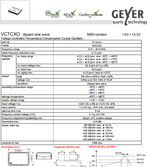 Geyer晶振,KXO-83晶振,壓控溫補晶振.小型SMD有源晶振,從最初超大體積到現在的7050mm,6035mm,5032mm,3225mm,2520mm體積,有著翻天覆地的改變,體積的變小也使產品帶來了更高的穩定性能,接縫密封石英晶體振蕩器,精度高,覆蓋頻率范圍寬的特點,SMD高速自動安裝和高溫回流焊設計,Optionable待機輸出三態輸出功能,電源電壓范圍:1.8V?5 V,高穩定性,低抖動,低功耗,主要應用領域:無線通訊,高端智能手機,平板筆記本WLAN,藍牙,數碼相機,DSL和其他IT產品的晶振應用,三態功能,PC和LCDM等高端數碼領域,符合RoHS/無鉛.