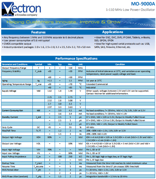 VECTRON晶振,MO-9000A晶振,低電壓振蕩器.小體積貼片2520mm晶振,外觀小型,表面貼片型晶體諧振器,因本身體積小等優(yōu)勢,適用于移動通信終端的基準(zhǔn)時鐘等移動通信領(lǐng)域.小型,薄型,輕型 (2.5 × 2.0 × 0.75mm typ.) 具備優(yōu)良的耐環(huán)境特性及高耐熱性強(qiáng).滿足無鉛焊接的回流溫度曲線要求.