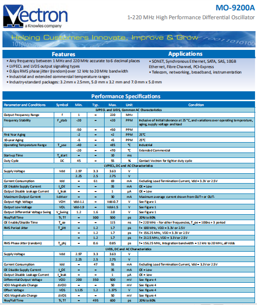 VECTRON晶振,MO-9200A晶振,SPXO有源晶振.貼片式石英晶體振蕩器,低電壓啟動功率,并且有多種電壓供選擇,比如有1.8V,2.5V,3.3V,3.8V,5V等,產品被廣泛應用于,平板筆記本,GPS系統,光纖通道,千兆以太網,串行ATA,串行連接SCSI,PCI-Express的SDH / SONET發射基站等領域.符合RoHS/無鉛.