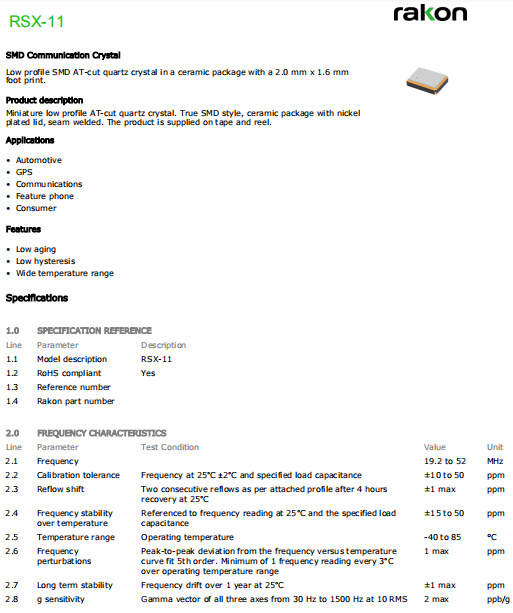 Rakon晶振,RSX-11晶振,耐高溫石英晶體.普通石英晶振,外觀完全使用金屬材料封裝的,產品本身采用全自動石英晶體檢測儀,以及跌落,漏氣等苛刻實驗.產品本身具有高穩定性,高可靠性的石英晶體諧振器,焊接方面支持表面貼裝,外觀采用金屬封裝,具有充分的密封性能,晶振本身能確保其高可靠性,采用編帶包裝,可對應產品應用到自動貼片機告訴安裝,滿足無鉛焊接的高溫回流溫度曲線要求.
