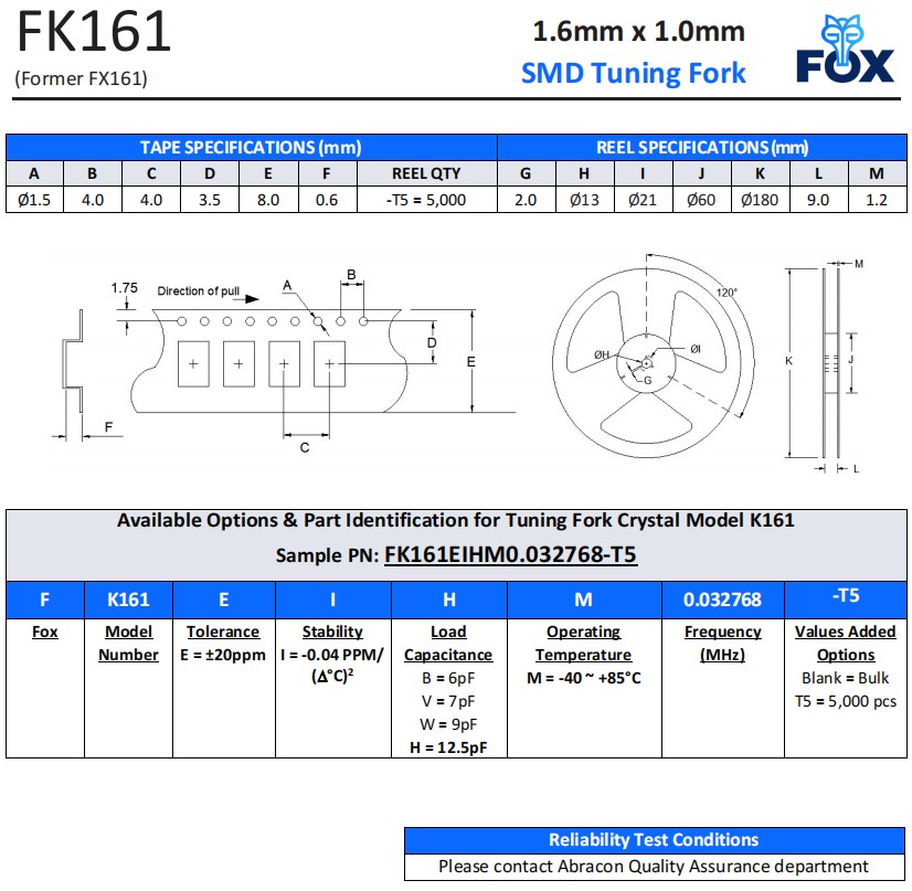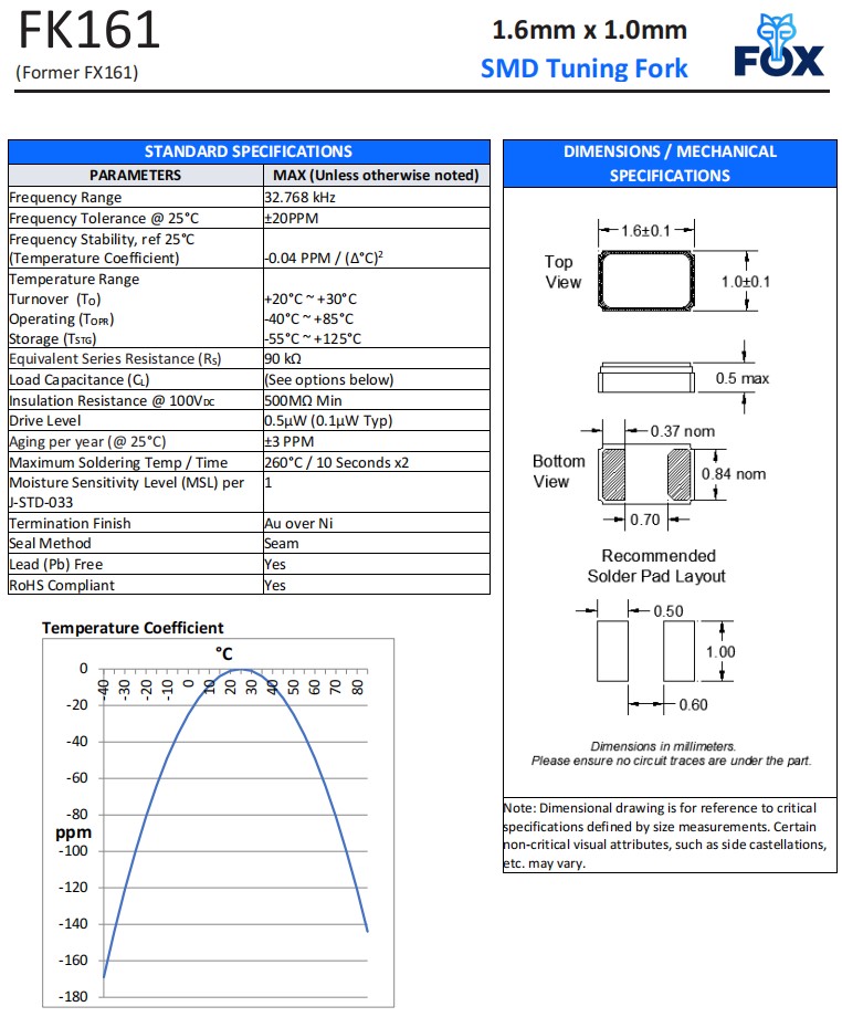 FOX超小型晶振,FK161EIHM0.032768-T5,智能手機6G晶振,參數表