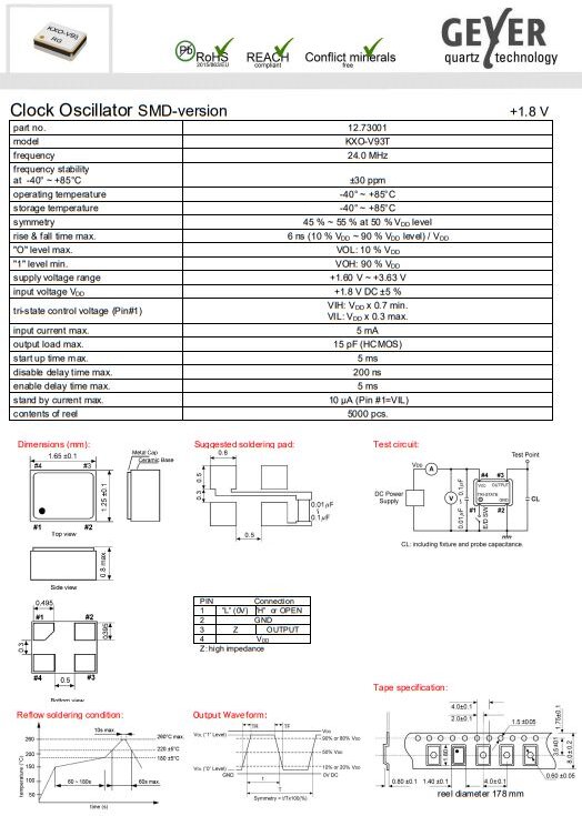 12.73001,KXO-V93T-18,Geyer晶振,1612mm,石英晶體振蕩器,微型晶振,超薄晶振,具有耐環境耐熱性,原廠代碼:12.73001,型號:KXO-V93T-18,尺寸:1.6*1.2mm,頻率:24MHZ,頻率偏差:±30ppm,電壓:1.8V,溫度偏差:-40°至85℃,負載電容:15pf,廣泛運用于電子物品,汽車部件等行業。