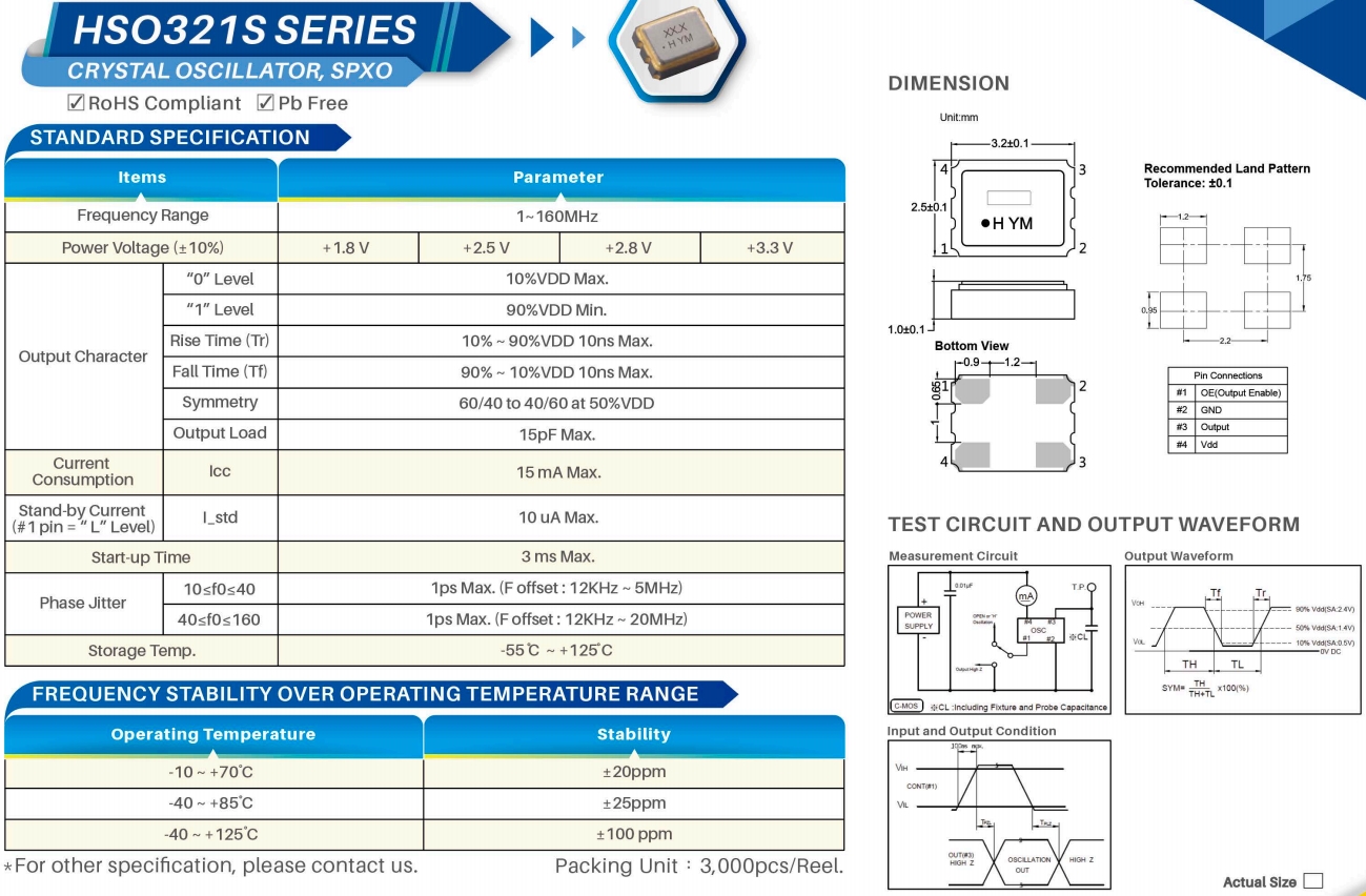 HELE加高3225振蕩器,SSW050000I3CHE-T,HSO321S有源晶體 參數表