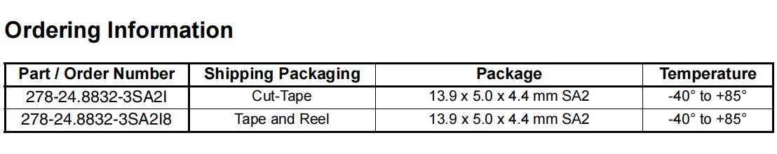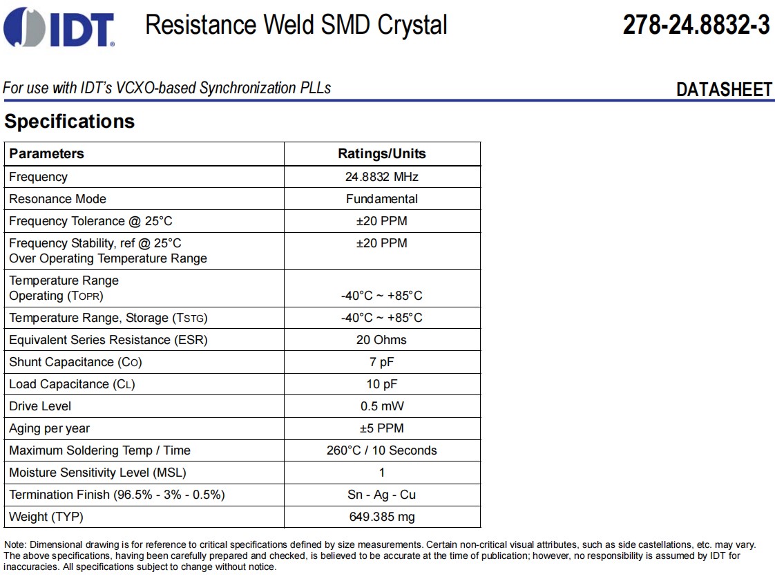 IDT艾迪悌石英晶體,278-24.8832-3SA2I8,6G藍(lán)牙模塊晶振,278-24.8832-3SA2I,無源晶振,參數(shù)表