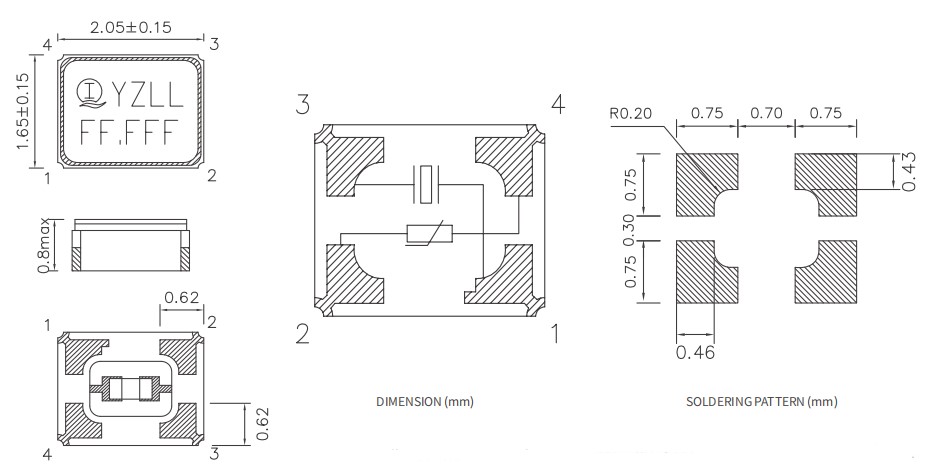 2016mm,THR-2016,Interquip應達利晶振,石英晶體諧振器,超小型晶振,智能穿戴設備晶振,尺寸圖