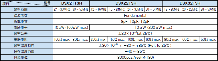 DSX321SL金屬面晶振,DSX321SH晶體諧振器,家用電器晶振,小型·薄型,SMD晶振3225尺寸、厚度0.65mm,耐熱性卓越,高精度、高可靠性,支持廣泛的頻率12MHz~50MHz,無需防濕包裝管理,Moisture Sensitivity Level:LEVEL1(IPC/JEDEC J-STD-033),依據(jù)AEC-Q200,用途通信機(jī)、近距離無線模塊、DVC、DSC、PDA、PC等小型設(shè)備,多媒體設(shè)備等車載用途.