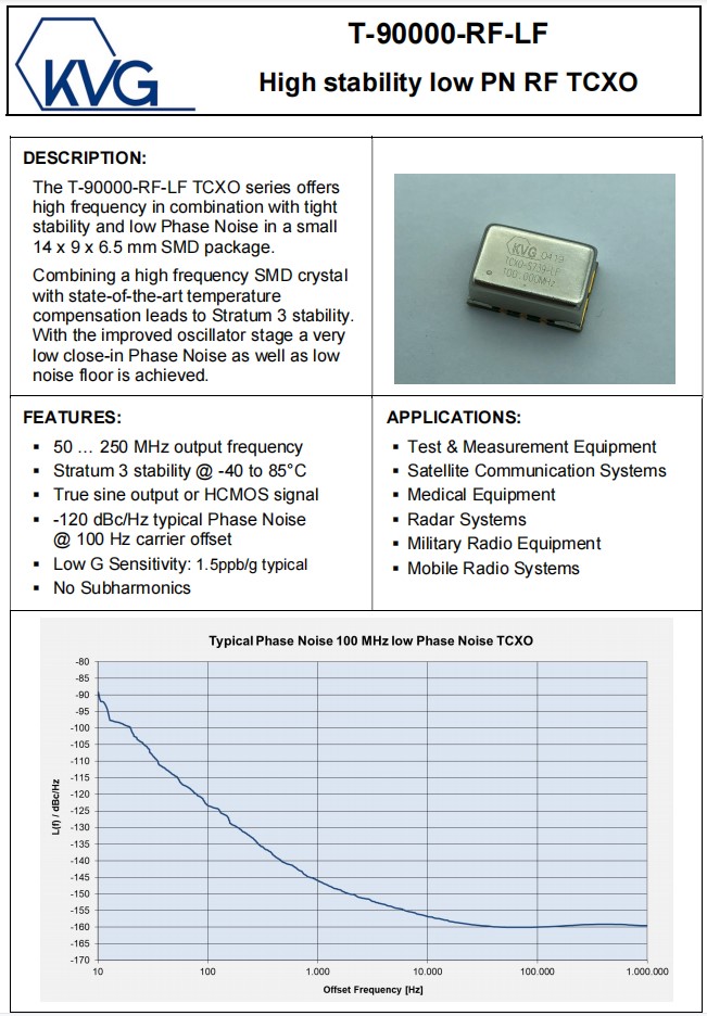 TCXO振蕩器,T-9B4085MXS-LF-125.000MHz,KVG低相位噪聲6G晶振,德國進口晶振,KVG晶振,型號:T-90000-RF-LF,編碼為:T-9B4085MXS-LF-125.000MHz,頻率為:125.000MHz,T-90000-RF-LF TCXO溫補晶體振蕩器系列在一個小型14 x 9 x 6.5 mm石英晶體振蕩器,SMD封裝中提供了高頻結合緊密穩定性和低相位噪聲。將高頻SMD晶體與最先進的溫度補償技術相結合,可以獲得第3層的穩定性。通過改進的振蕩器級,實現了非常低的近相噪聲和低噪聲地板。層3穩定性@-40~85°C,真正弦輸出或HCMOS信號,-120 dBc/Hz典型相位噪聲@ 100 Hz載波偏移,低G靈敏度: 1.5ppb/g典型,無次諧波。T-90000-RF-LF有源晶振應用于:測試和測量設備,衛星通信系統,醫療設備,雷達系統,軍用無線電設備,移動無線電系統。