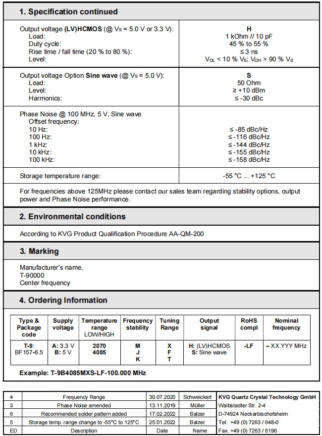 TCXO振蕩器,T-9B4085MXS-LF-125.000MHz,KVG低相位噪聲6G晶振,參數表
