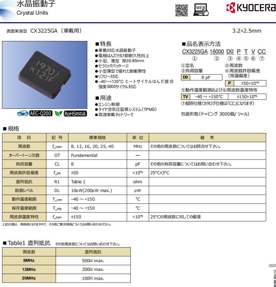 | CX3225GA25000D0PTVCC | Kyocera晶振 | CX3225GA, Kyocera | MHz Crystal | 25MHz | -40°C ~ 150°C |