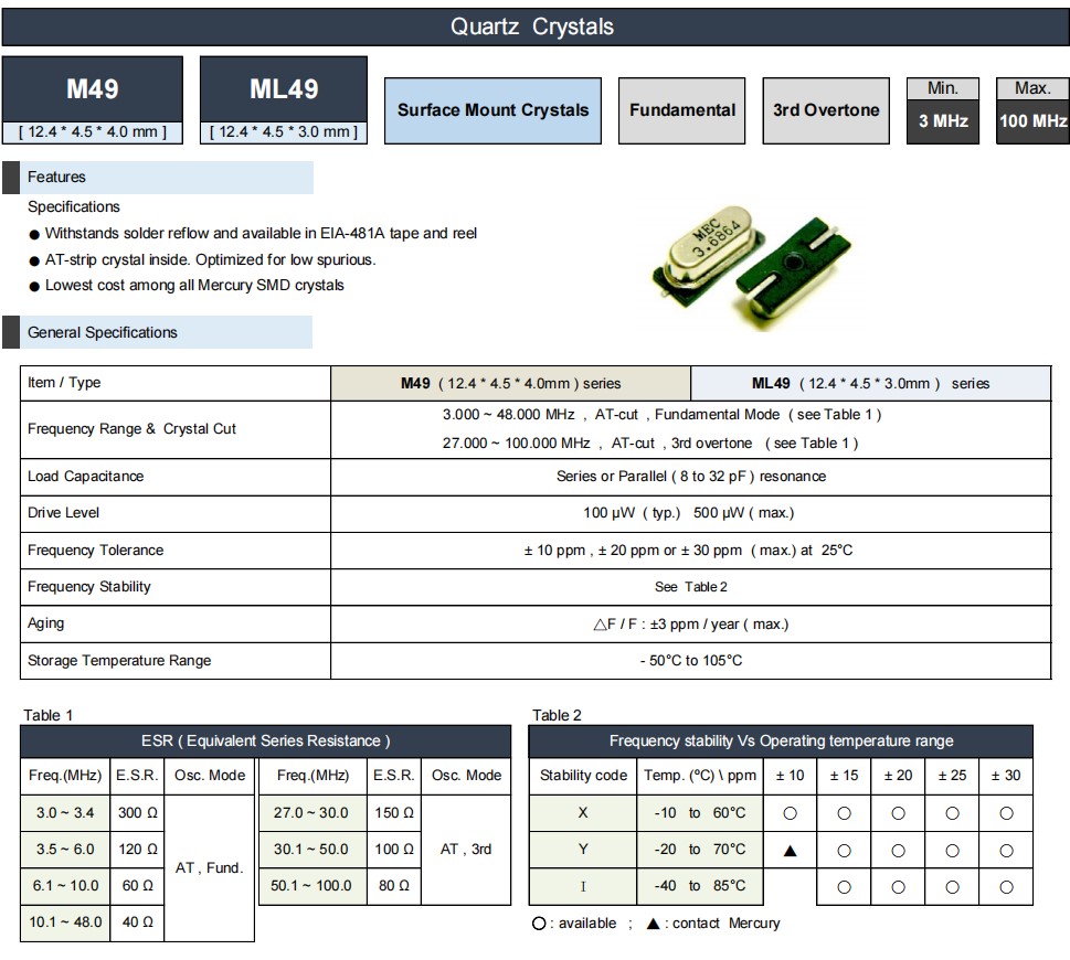 MERCURY貼片晶振,M49-24.000-18-20/30H/15R,6G通訊設(shè)備晶振,M49-26.000-12-18/20I/15R,無源晶振,參數(shù)表