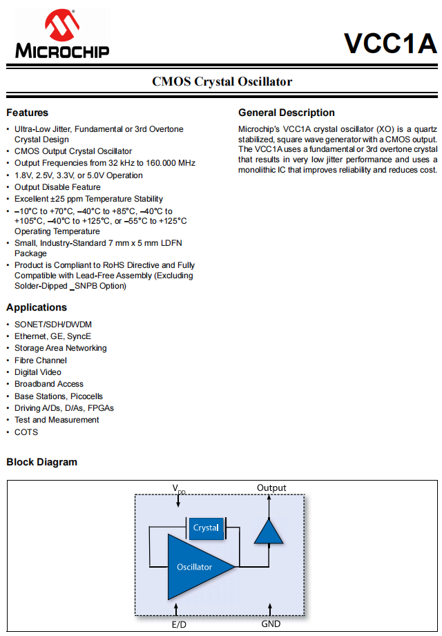 VCC1A-E3R-22M2500000TR,7050mm,22.250MHz,Microchip晶振,VCC1A,寬帶接入應(yīng)用晶振,產(chǎn)品特點(diǎn):