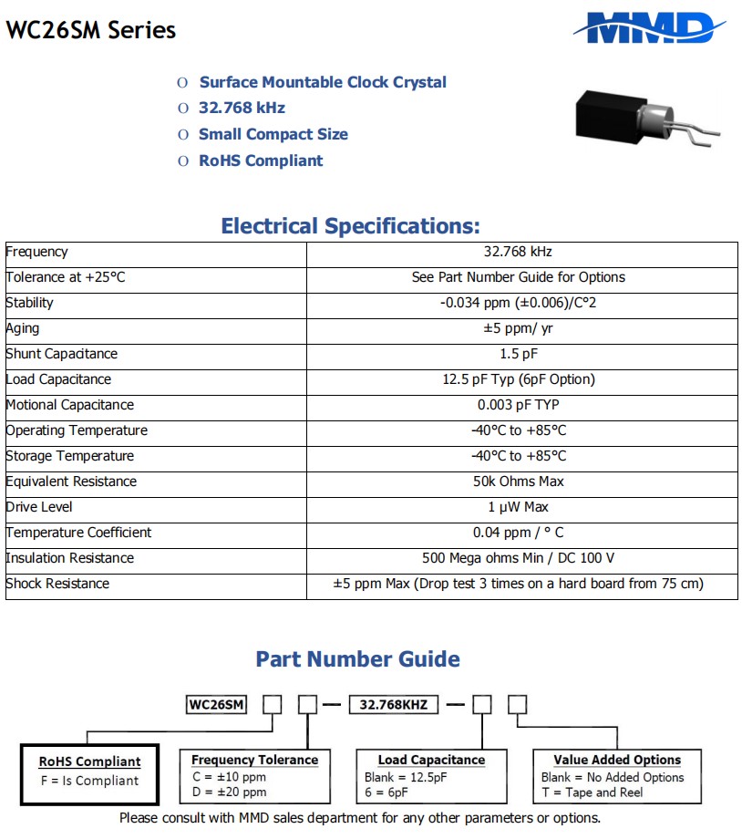 Mmdcomp麥迪康晶振,WC26SMFD-32.768KHZ-T,時鐘晶體6G晶振,無源晶振,美國進口晶振,參數表