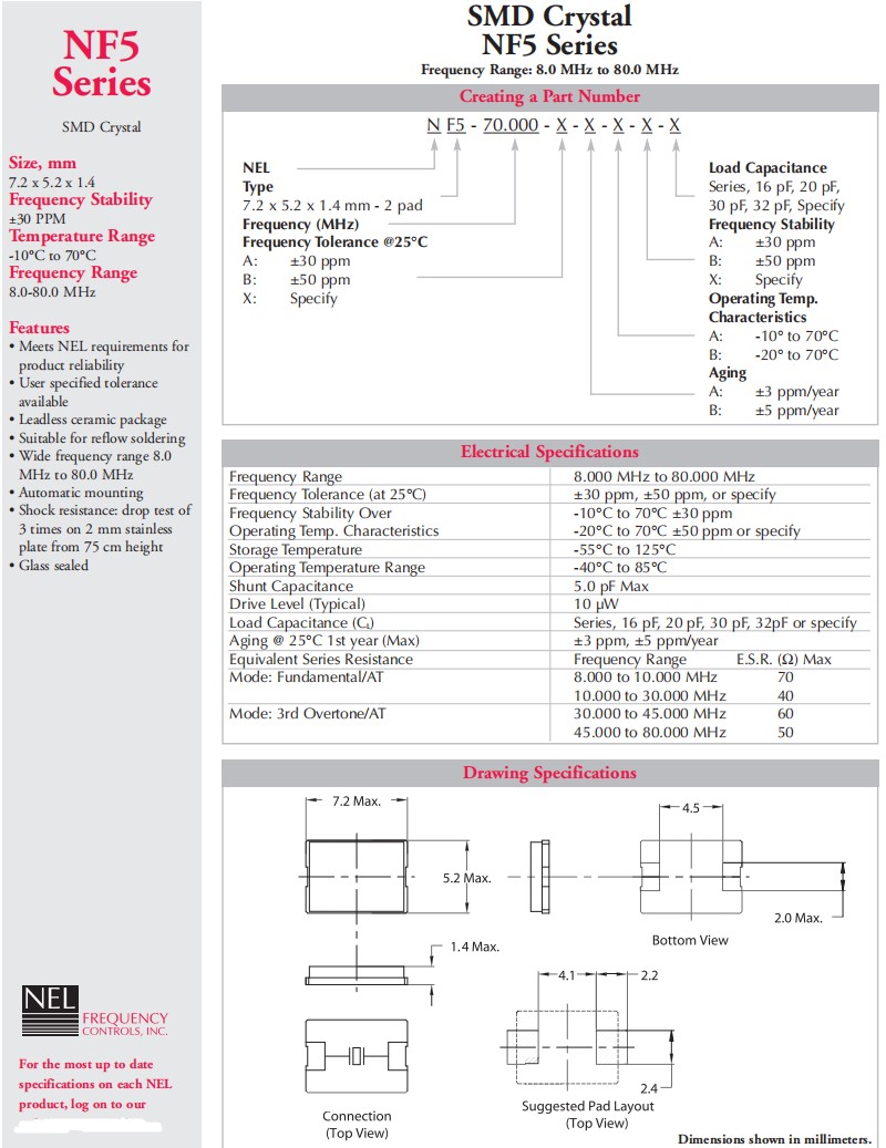 NF5-19.200-A-A-B-A-20pF,7050mm,19.2MHz,NEL品牌,NF5,兩腳貼片晶振,產品特點: