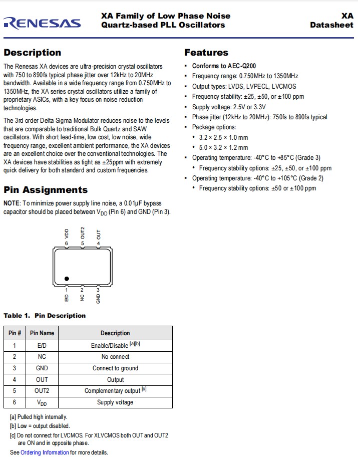 Renesas XA器件是超精密晶體振蕩器,具有750到890fs的典型的超過12 kHz到20MHz帶寬的相位抖動。XA系列晶體振蕩器振從0.750MHz到1350MHz到1350MHz,利用了一系列專有的asic,重點關注降噪技術。三階西格瑪調制器將噪聲降低到可與傳統的散裝石英和鋸紋波振蕩器相媲美的水平。XA系列具有較短的前置時間、低成本、低噪聲、頻率范圍廣、優異的環境性能,是超越傳統技術的優秀選擇。XA設備的穩定性高達±25ppm,標準和自定義頻率都非常快。