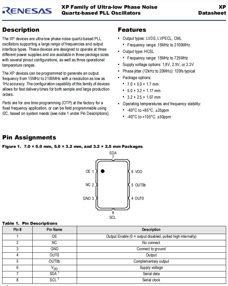 | XPC336156.250000I | Renesas晶振 | CLCC 3.20X2.50X0.95 MM, 2.10MM P | XPC | 156.25 MHz | CML |