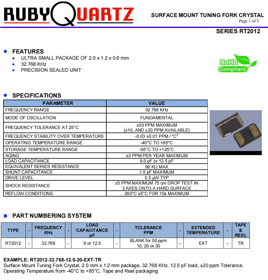 盧柏32.768K時鐘晶體,6G通信晶振,RT2012-32.768-9-10-EXT-TR 參數表