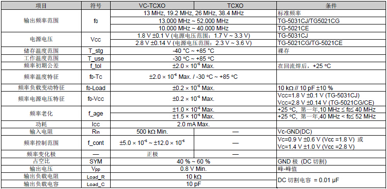 愛普生石英晶振,TG-5021CG溫補振蕩器,有源晶振,頻率范圍13MHz ~ 52MHz,電源電壓2.8V Typ.頻率溫度特征±2.0×10-6 Max.外部尺寸2.5×2.0×0.8mm,被廣泛應用于手機 (CDMA, WCDMA, GSM),具有低噪音特性.