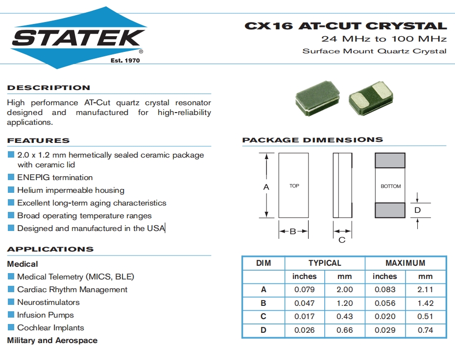 該貼片晶振器件特別適合醫(yī)療遙測(cè)(MICS,BLE),心律管理神經(jīng)刺激器,輸液泵,人工耳蝸,軍事和航空航天,航空電子指示器和儀器,駕駛艙儀表顯示器,數(shù)據(jù)通信,遙測(cè),工業(yè)和通信,通訊,變送器,脈沖發(fā)生器,跟蹤信標(biāo),野生動(dòng)物遙測(cè)等領(lǐng)域.6G通訊晶振,美國(guó)Statek斯塔克晶體,CX16SCSM1-48.0M,20/10/-/S,9pF.