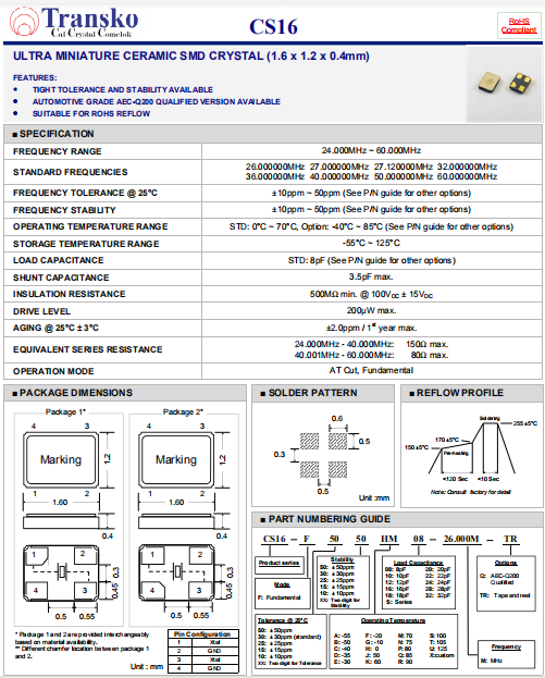 Transko晶振,CS16晶振,無鉛環(huán)保晶體,貼片壓電石英晶體,體積小,焊接可采用自動貼片系統(tǒng),產(chǎn)品本身小型,表面貼片晶振,特別適用于有小型化要求的電子數(shù)碼產(chǎn)品市場領(lǐng)域,因產(chǎn)品小型,薄型優(yōu)勢,耐環(huán)境特性,包括耐高溫,耐沖擊性等,在移動通信領(lǐng)域得到了廣泛的應(yīng)用,晶振產(chǎn)品本身可發(fā)揮優(yōu)良的電氣特性,滿足無鉛焊接的高溫回流溫度曲線要求.