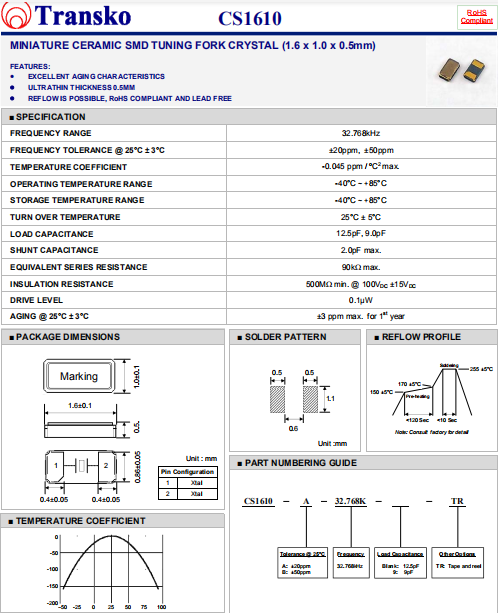 Transko晶振,CS1610晶振,進(jìn)口音叉石英晶體,超小型,薄型,質(zhì)地輕的表面貼片音叉型石英晶體諧振器,手機(jī)晶體,產(chǎn)品體積小,特別適用于各種小巧的便攜式消費(fèi)電子數(shù)碼產(chǎn)品,在移動(dòng)通信領(lǐng)域得到了廣泛的應(yīng)用,晶振產(chǎn)品本身可發(fā)揮優(yōu)良的電氣特性,滿足無(wú)鉛焊接的高溫回流溫度曲線要求.