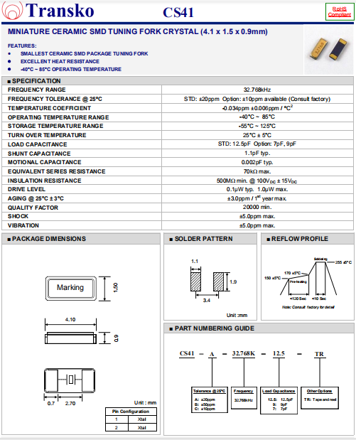 Transko晶振,CS41晶振,音叉晶體,貼片壓電石英晶體,體積小,焊接可采用自動貼片系統,產品本身小型,表面貼片晶振,特別適用于有小型化要求的電子數碼產品市場領域,因產品小型,薄型優勢,耐環境特性,包括耐高溫,耐沖擊性等,在移動通信領域得到了廣泛的應用,晶振產品本身可發揮優良的電氣特性,滿足無鉛焊接的高溫回流溫度曲線要求.