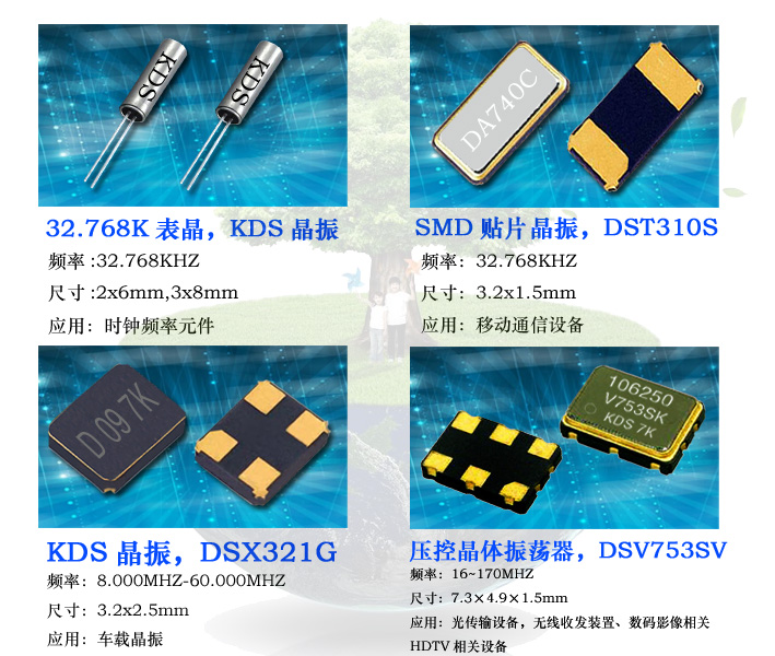 KDS晶振是全球最大的晶振制造工廠,工廠遍及中國大陸,臺灣,泰國,印度尼西亞等十多個制造中心,KDS晶振是四大晶振品牌中型號最多的一個,品種也很齊全,包括SMD貼片晶體諧振器,32.768K貼片晶振,石英晶體振蕩器以及微型超小尺寸晶體諧振器,KDS晶振被航天航空,軍工產品,車用電子,通信,儀器儀表等高科技產品廣泛應用,是全球領先的三大晶振制造商之一。